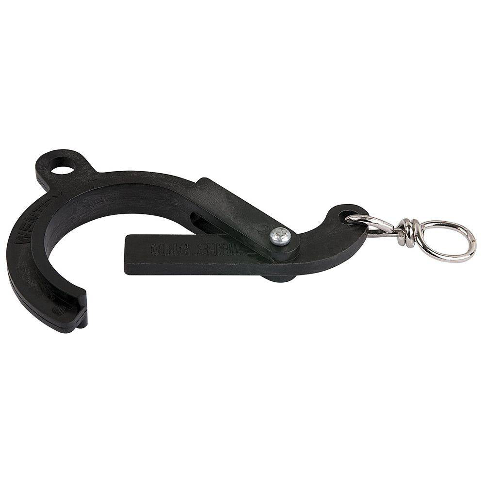 Dit is de meestgebruikte haak voor het ophangen van een backdrop of theaterdoek. Als er geen gewicht aan de haak hangt kan hij gemakkelijk openen, maar met gewicht klemt hij zich vast. Dit is de versie zonder sleutelring, geschikt voor een S-haak.